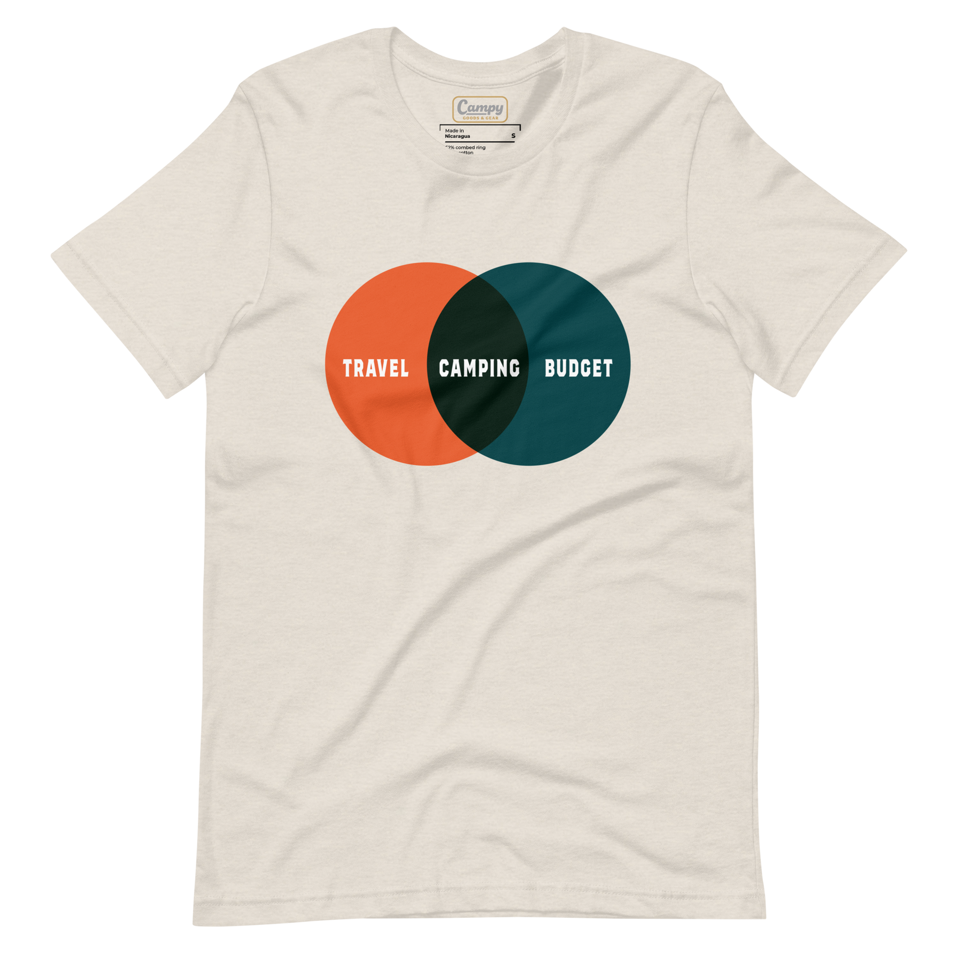 Showcase the perfect compromise with the "Camping Venn Diagram" T-Shirt. Featuring a clever Venn diagram where travel and budget intersect at camping, this shirt humorously highlights the balance between adventure and affordability. Made from a premium blend of ring-spun cotton and polyester, our shirts are soft, lightweight, and have just the right amount of stretch, ensuring comfort and a flattering fit for everyone. Ideal for budget travelers, campers, and outdoor enthusiasts, this tee is a smart and stylish addition to your adventure wardrobe.