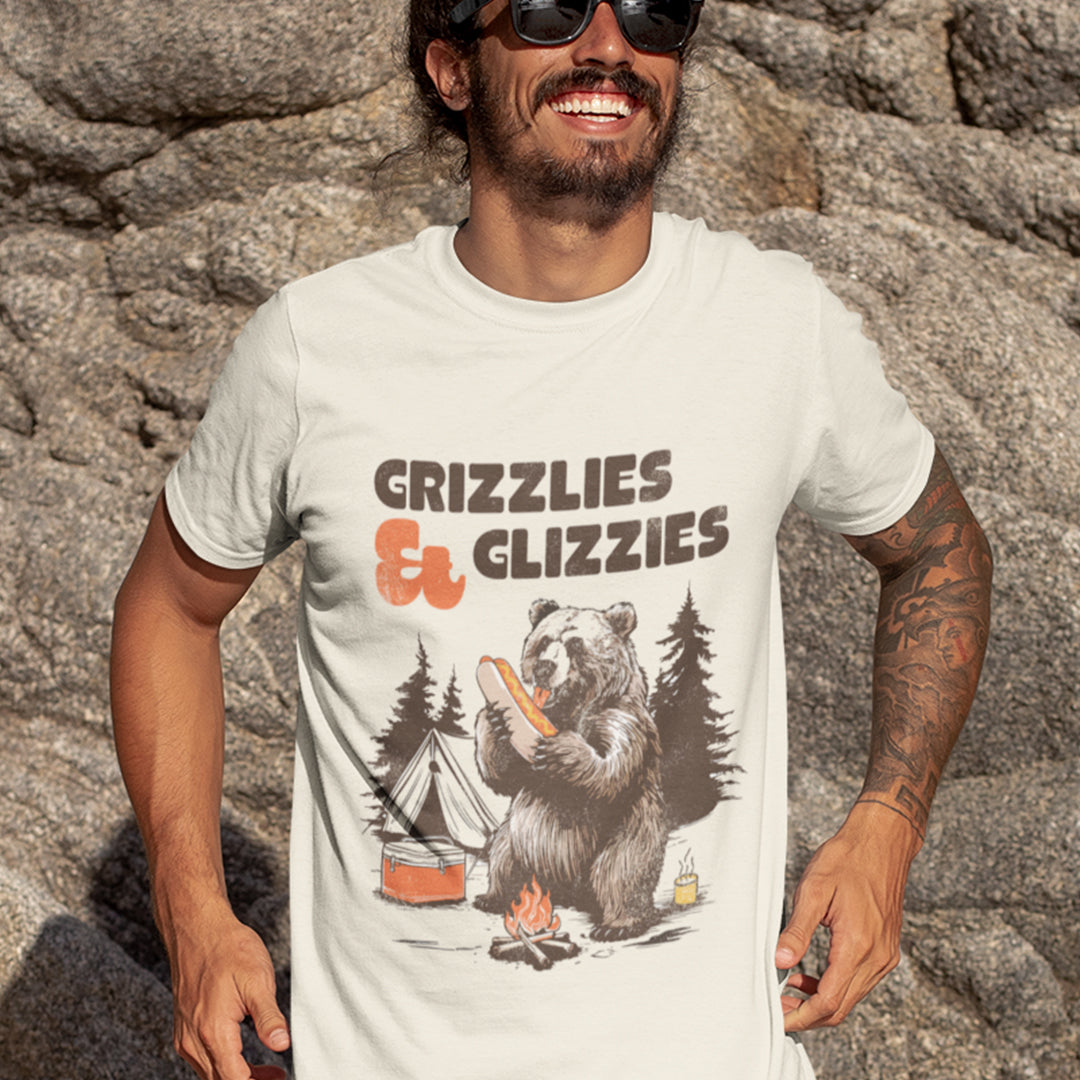 Introducing our "Grizzlies & Glizzies" t-shirt, perfect for those who enjoy a touch of humor with their love for the outdoors. This tee features a vintage illustration of a grizzly bear munching on a hot dog, blending a playful graphic with a classic design. Made from soft, lightweight fabric with just the right amount of stretch, it’s comfortable and flattering for all. Ideal for campfires, casual outings, or just showing off your fun side, this t-shirt is a unique way to celebrate your favorite wildlife and snacks.