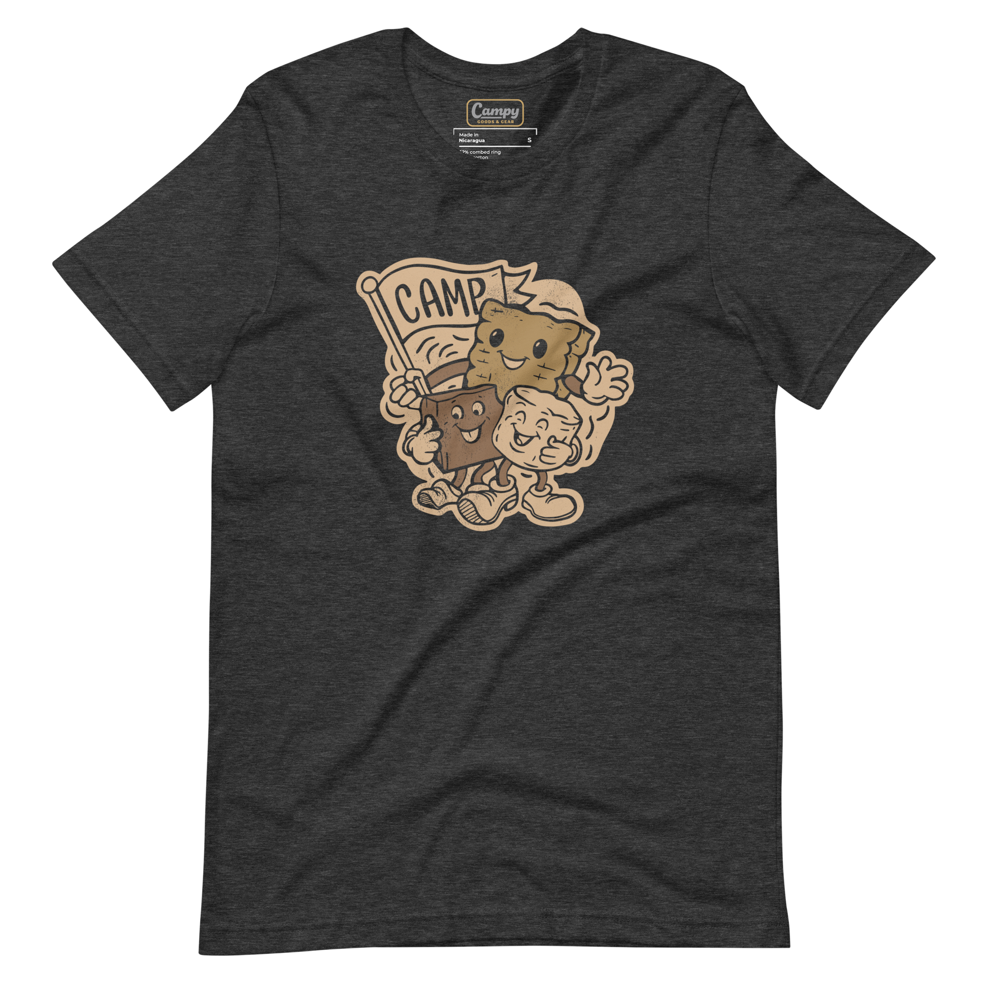 Introducing our "Group Hug" t-shirt, perfect for campfire enthusiasts and s'more lovers. This heather black tee features a retro, nostalgic-style graphic of smiling s'more ingredients hugging, reminiscent of simpler times. Made from soft, lightweight fabric with just the right amount of stretch, it's comfortable and flattering for all. Whether you're gathered around the campfire or enjoying a casual day out, this fun and whimsical t-shirt is a great way to show your love for camping and s'mores.