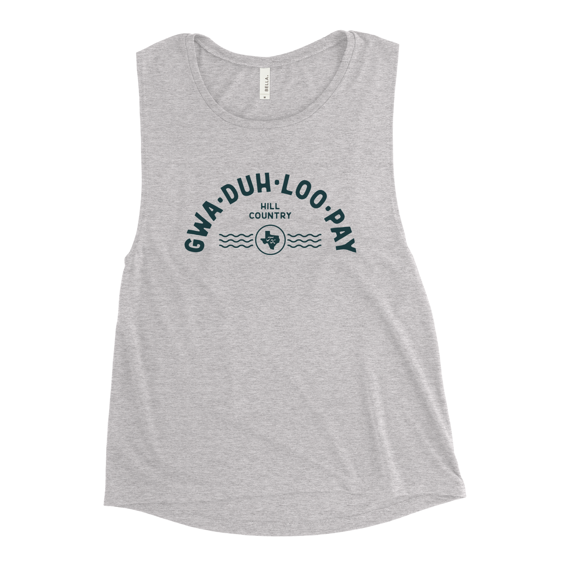 Featuring the witty phrase "GWAH DUH LOO PAY," this tank playfully captures the phonetic pronunciation of the infamous Guadalupe River, a beloved landmark in the Hill Country.
