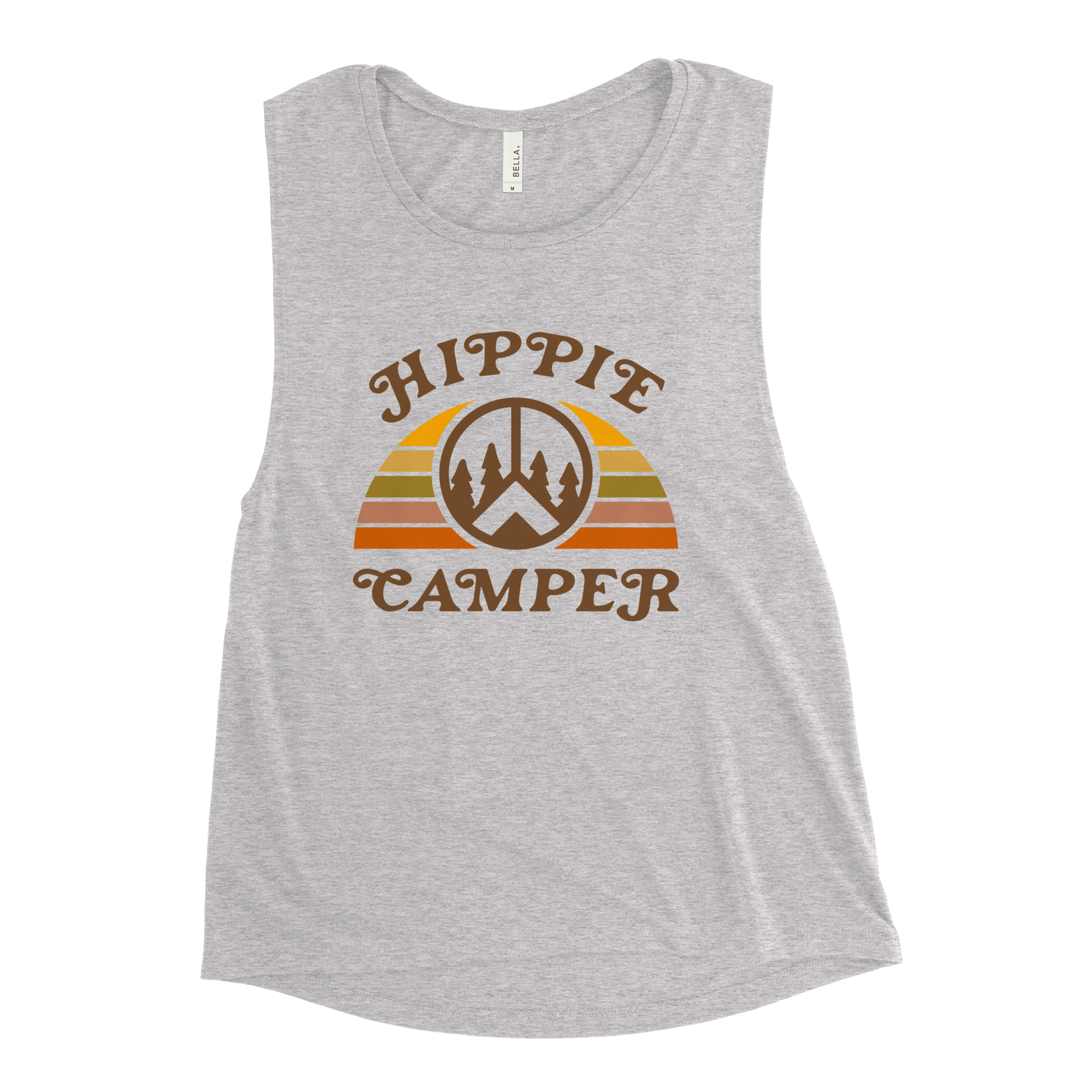 Featuring a vintage-inspired peace sign adorned with a camping scene, this tank exudes old-school charm with a touch of whimsy. The phrase "Hippie Camper" boldly displayed below the design captures the carefree spirit of the open road and outdoor living.