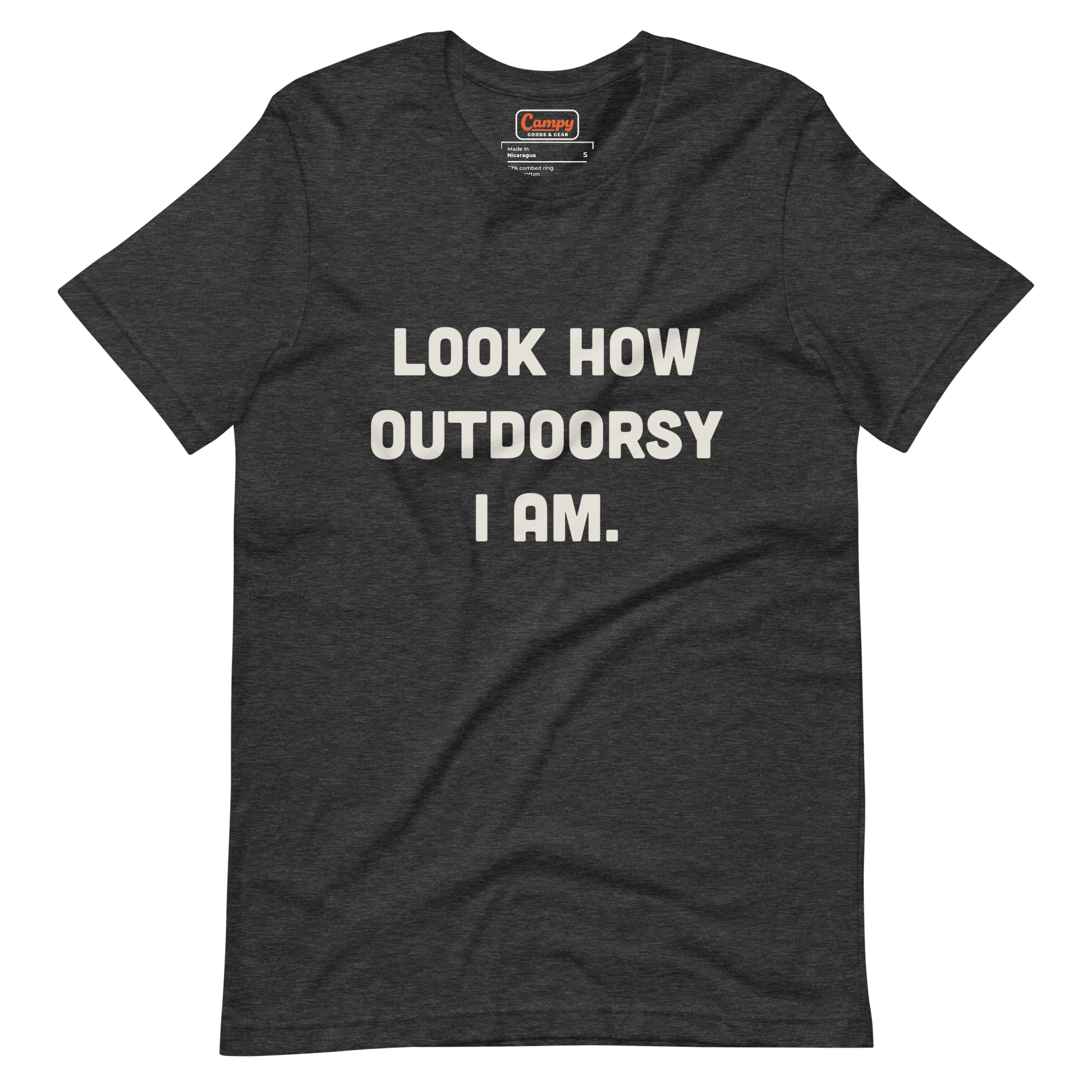 Show off your adventurous side with our *"Look How Outdoorsy I Am"* T-shirt! Whether you're a seasoned explorer or just here for the s'mores, this tee is perfect for anyone who loves to have a little fun with their outdoor cred. Soft, comfy, and packed with personality, it’s great for hikes, campfire chats, or even just pretending you know how to pitch a tent.