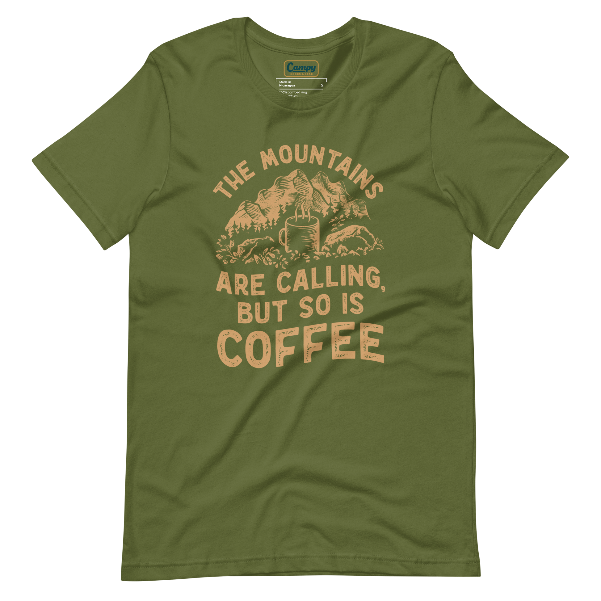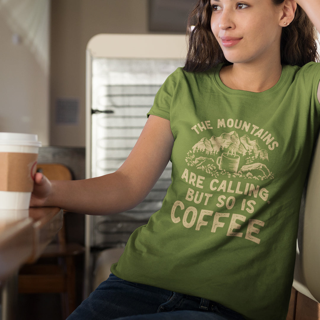 Introducing our "The Mountains Are Calling, But So Is Coffee" t-shirt, perfect for outdoor enthusiasts and coffee lovers! This tee combines a love for adventure with a passion for that morning cup of joe. It features a charming design that captures the essence of both the great outdoors and the cozy comfort of coffee. Soft and lightweight with just the right amount of stretch, this shirt is comfortable and flattering for all. Whether you're gearing up for a hike or enjoying a quiet morning at camp, this unique t-shirt is a must-have for nature and coffee lovers alike.
