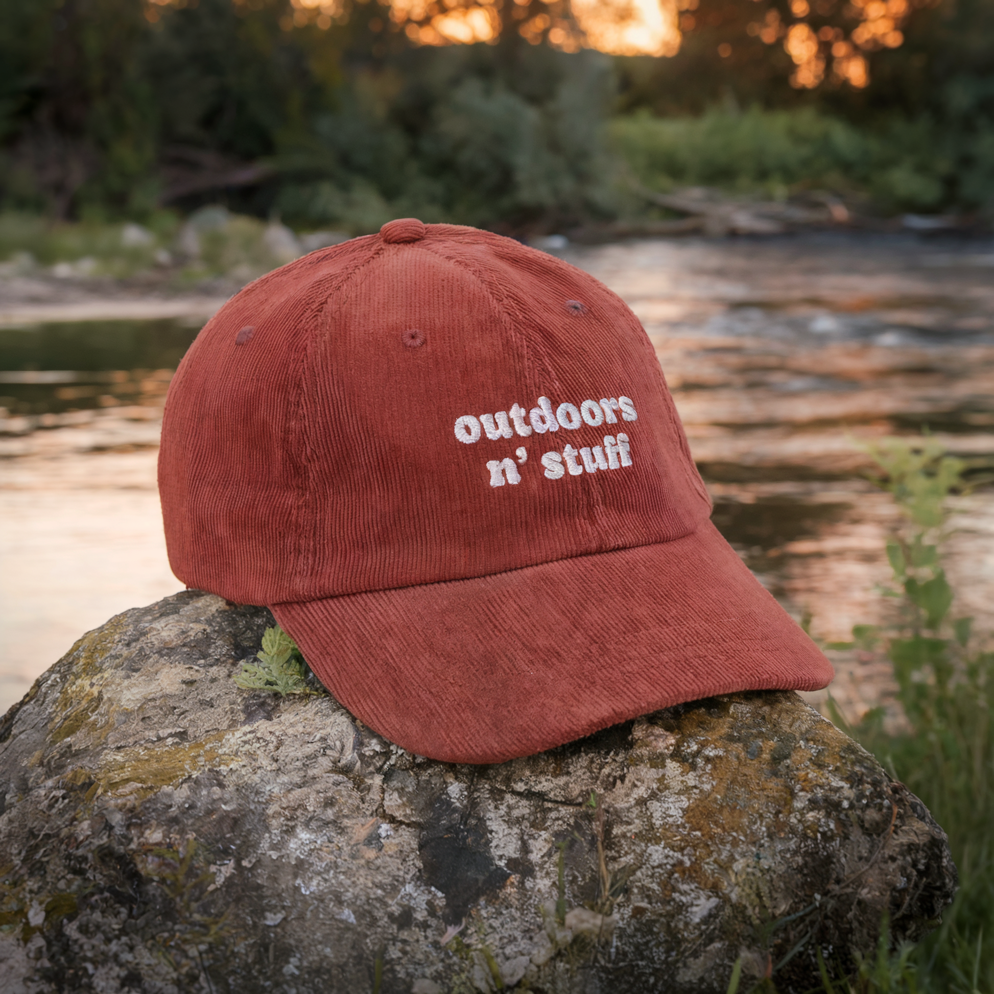 Get ready to roam with our Outdoors n' Stuff vintage corduroy cap! Made from 100% cotton corduroy that’s as comfy as your favorite trail jacket, this hat is for anyone who’s all about adventures, big or small. Whether you’re hiking, camping, or just vibing in nature, the embroidered design says it all. With an adjustable gold buckle for a perfect fit and a visor to keep the sun off your face, it’s the go-to cap for those who do outdoors... and a little bit of everything else.