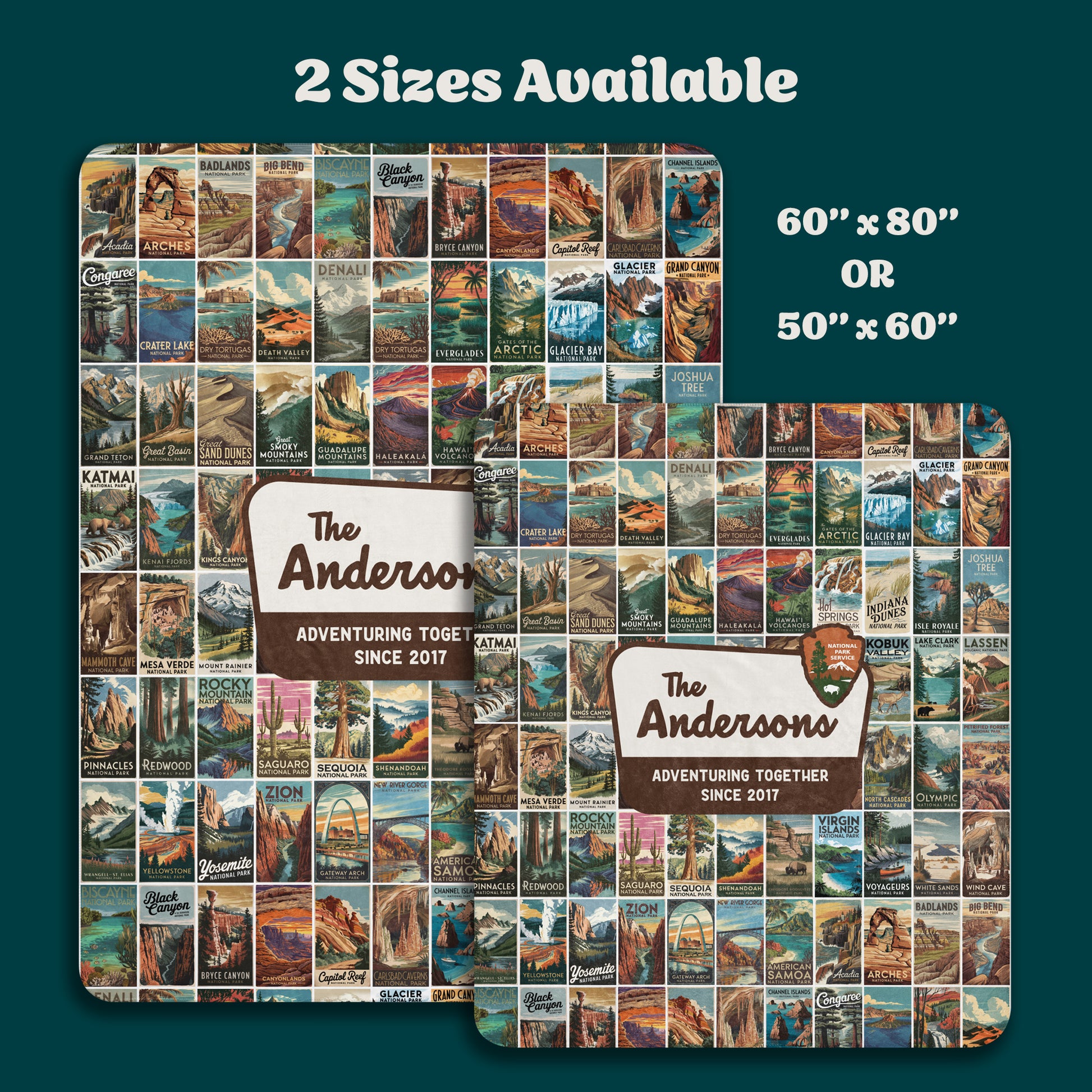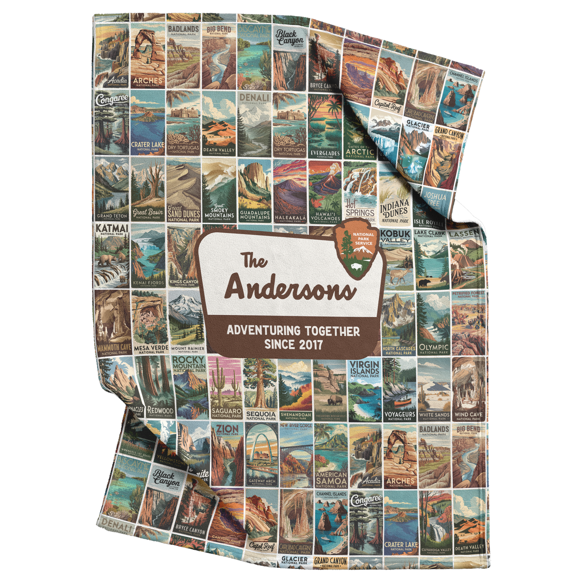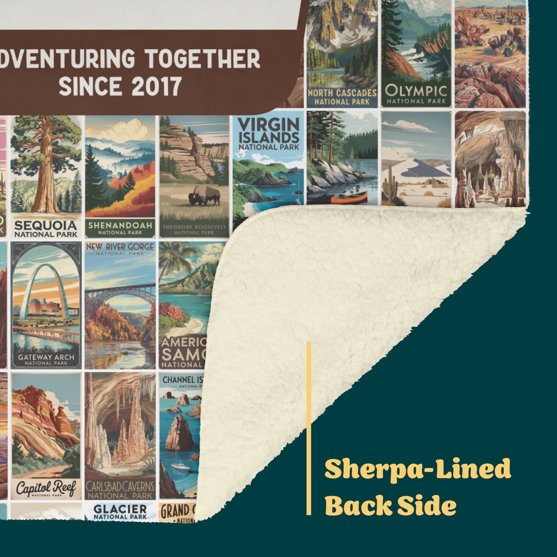 Wrap your loved ones in warmth and wanderlust with this Personalized National Parks Sherpa Blanket, featuring all 63 U.S. National Parks in stunning, vintage-inspired detail! Perfect for national park lovers, this customizable blanket includes your family name and the phrase "Adventuring Together Since ___," where you can personalize the date marking the start of your family’s adventures.