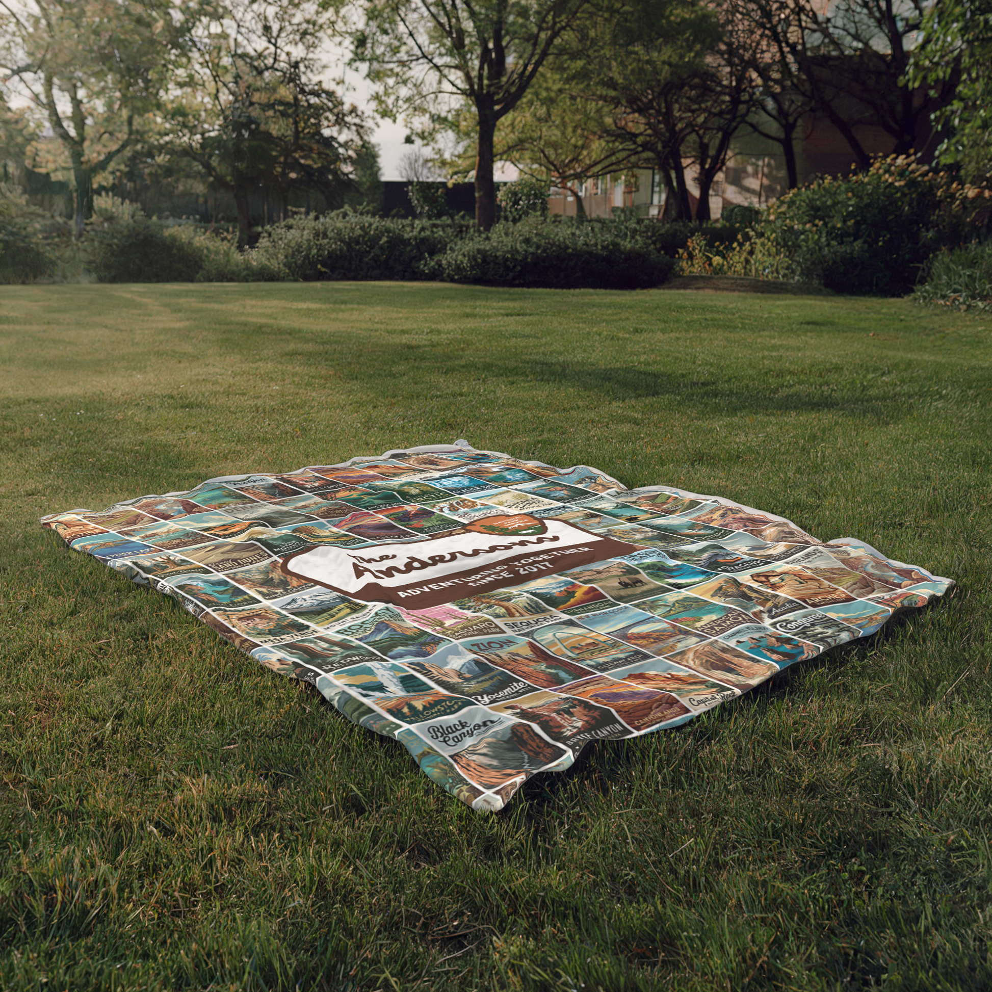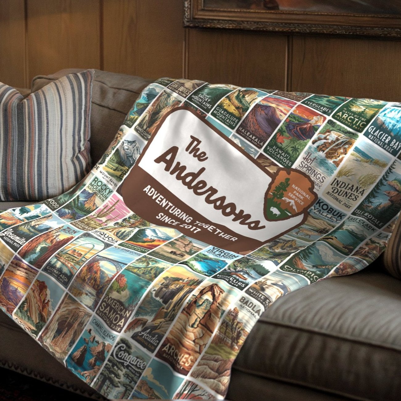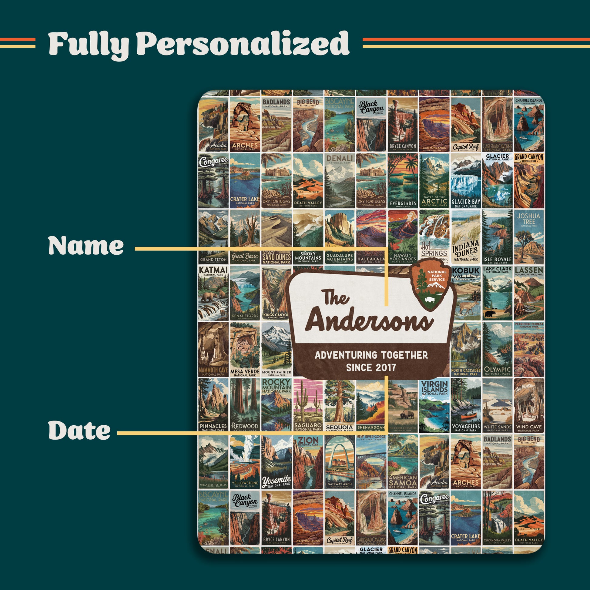 Wrap your loved ones in warmth and wanderlust with this Personalized National Parks Sherpa Blanket, featuring all 63 U.S. National Parks in stunning, vintage-inspired detail! Perfect for national park lovers, this customizable blanket includes your family name and the phrase "Adventuring Together Since ___," where you can personalize the date marking the start of your family’s adventures.