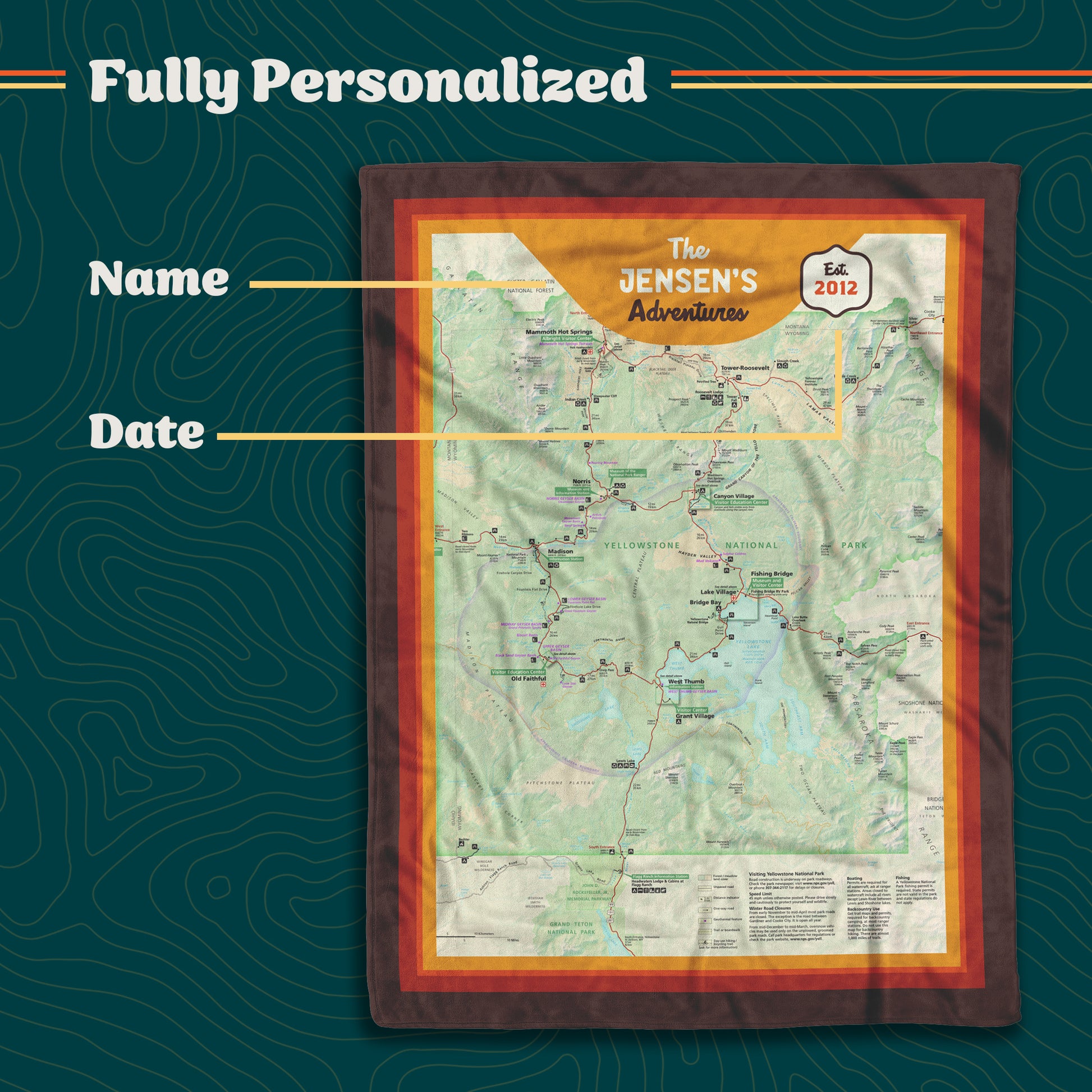 Wrap yourself in memories of Yellowstone National Park with this cozy personalized blanket! Featuring a beautifully detailed map of the park, it’s the perfect way to celebrate your favorite adventures. Add your family’s name for a unique keepsake or gift it to your outdoorsy loved ones to inspire their next trip. Ideal for snuggling at home or keeping warm by the campfire!