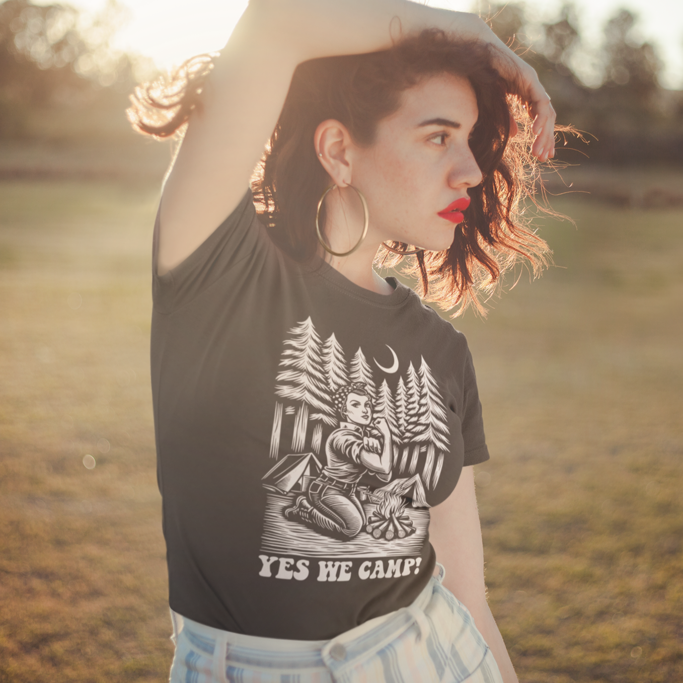 This isn't your grandma's camping trip! Our exclusive "Yes We Camp" shirt is a fun twist on the iconic Rosie the Riveter image, featuring a woman flexing her bicep next to a tent instead of a rivet gun. It's a bold statement for the modern outdoorswoman who's ready to conquer the campground in style.